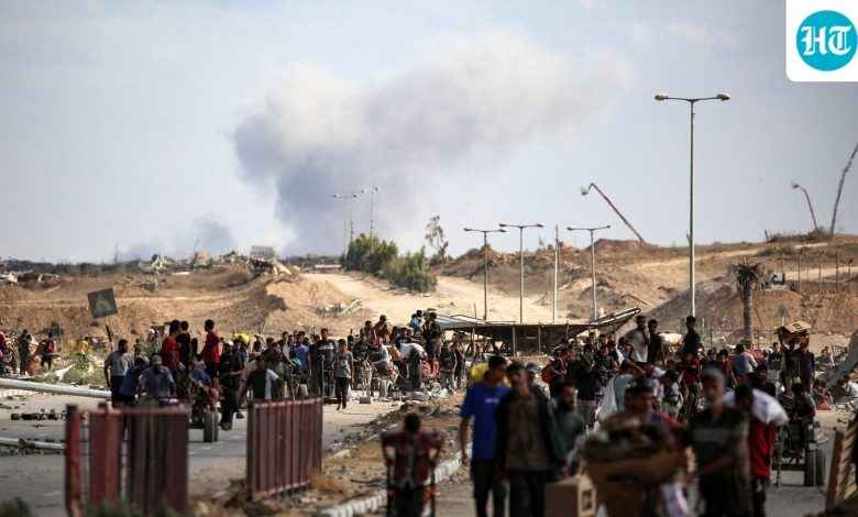 A plume of smoke rises in the background as Palestinians return from a food distribution point near the Netsarim corridor in the central Gaza Strip.(Eyad Baba/AFP)
