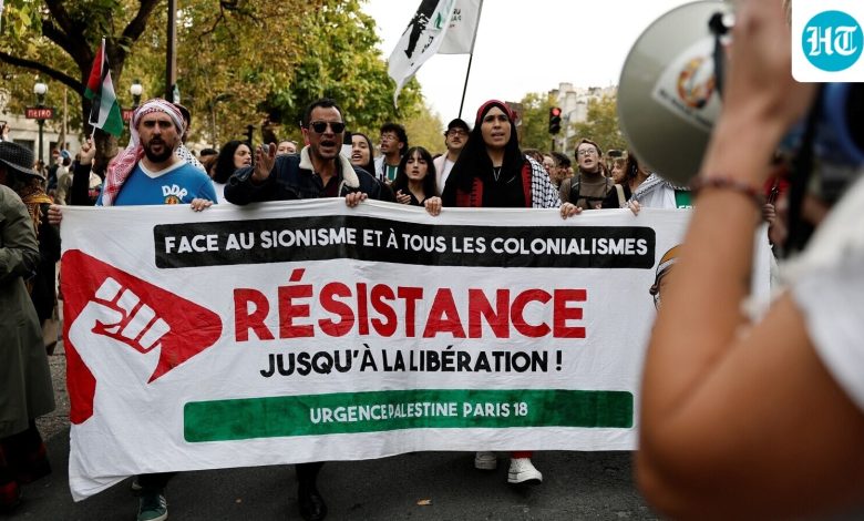 Protesters hold a banner with the colours of the Palestinian flag which reads “Against Zionism and all forms of colonialism, Resistance until liberation” (Reuters)